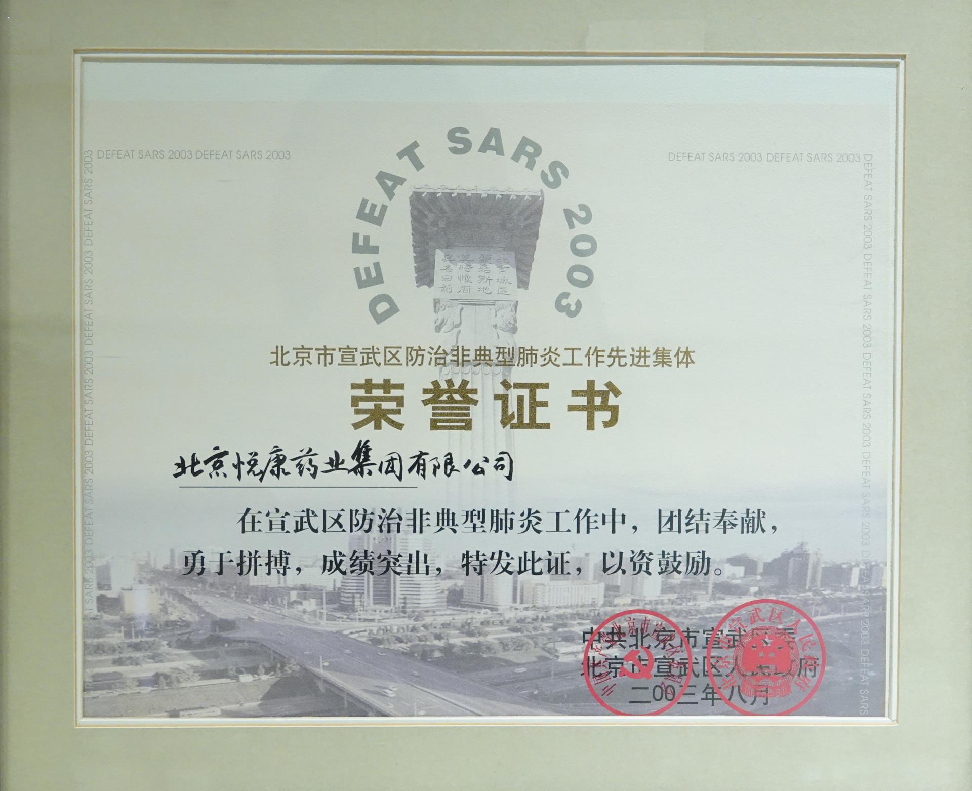 2003“非典"期间,向宣武区政府捐献价值100余万元的防“非典”药品。