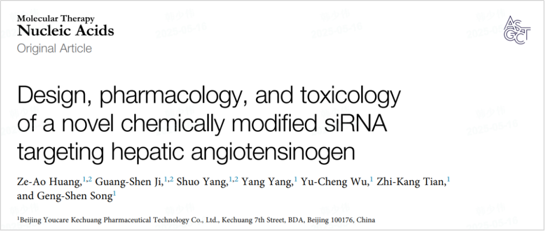 高血压被称为“沉默的杀手”,全球超13亿患者亟待更安全、更持久的治疗方案。近日,永利博彩子公司北京澳门永利博彩官方网站科创医药科技股份有限公司在核酸药物领域国际著名SCI期刊《Molecular Therapy-Nucleic Acids》在线发表了题为“Design, pharmacology, and toxicology of a novel chemically modified siRNA targeting hepatic angiotensinogen”的研究论文。文章报道了新型肝脏血管紧张素原(angiotensinogen,AGT)靶向siRNA候选药物的临床前开发过程——经生物信息学筛选、化学修饰优化及结合肝脏靶向配体,成功开发出了数种抑制活性、持续时间和安全性与此前相当或更优的siRNA。该疗法疗效持久、靶向精准,有望为高血压治疗带来新突破。