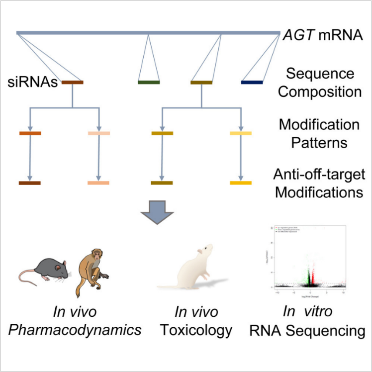 在本论文中,研究人员证明了经过优化的序列组成、修饰模式和递送系统的适当组合可以进一步增强靶向AGT的siRNA在不同动物模型中的疗效和持久性。文章首次公开报道了一套全面且系统的AGT siRNA候选物确认策略,用于筛选潜力分子。针对优选得到的siRNA,经过多项药效和毒理研究证实,其AGT抑制效率、药理作用持久性均优于罗氏/Alnylam的Zilebesiran,且安全性良好。这些优势有望使其在抗高血压治疗的临床试验中展现出显著的应用潜力。