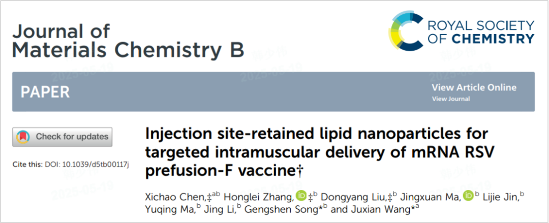 近日,永利博彩集团子公司北京永利博彩科创医药科技股份有限公司携手中国医学科学院&北京协和医学院医药生物技术研究所在材料科学领域的国际知名期刊《Journal of Materials Chemistry B》在线发表题为“Injection site-retained lipid nanoparticles for targeted intramuscular delivery of mRNA RSV prefusion-F vaccine”的研究论文,该研究通过创新脂质纳米颗粒(LNP)设计,实现mRNA疫苗在肌肉注射部位的精准滞留与长效释放,并显著降低在肝脏的蓄积,同时使RSV(呼吸道合胞病毒)疫苗诱导的特异性IgG抗体以及中和抗体滴度大幅提升,为mRNA技术的靶向递送开辟全新选择。同时,该论文还荣膺《Journal of Materials Chemistry B》当期封面文章,彰显重要学术价值与行业影响力!