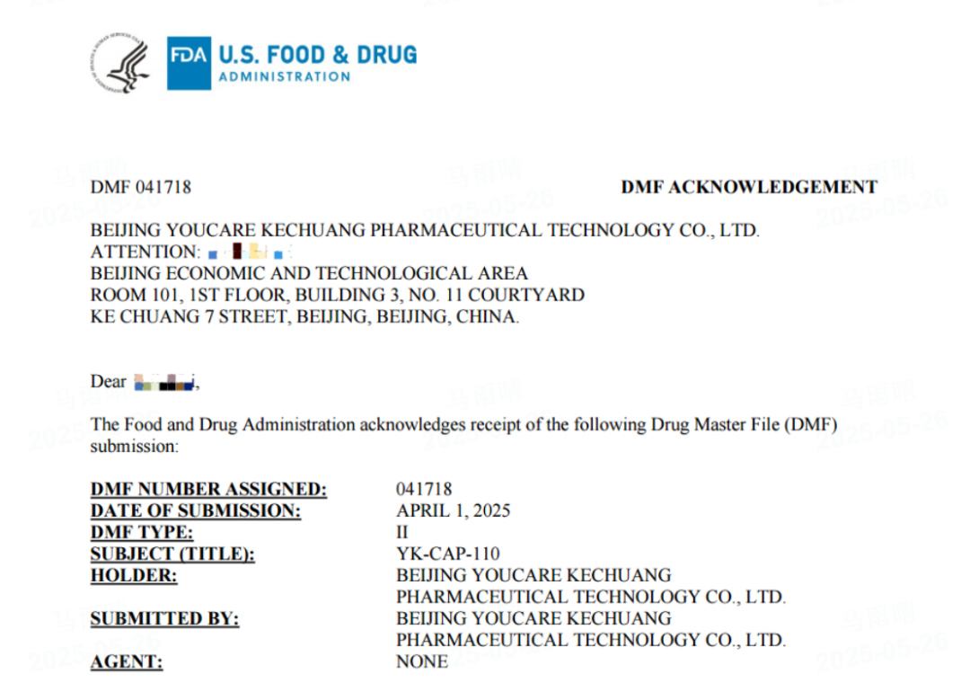 近日,澳门永利博彩官方网站集团子公司北京永利博彩科创医药科技股份有限公司自主研发的一款Cap1新型帽子结构(YK-CAP-110)收到美国食品药品监督管理局(FDA)颁发的DMF(药物主文件)备案确认函,完成DMF注册备案(备案号:041718)。