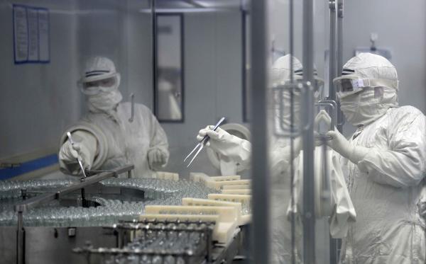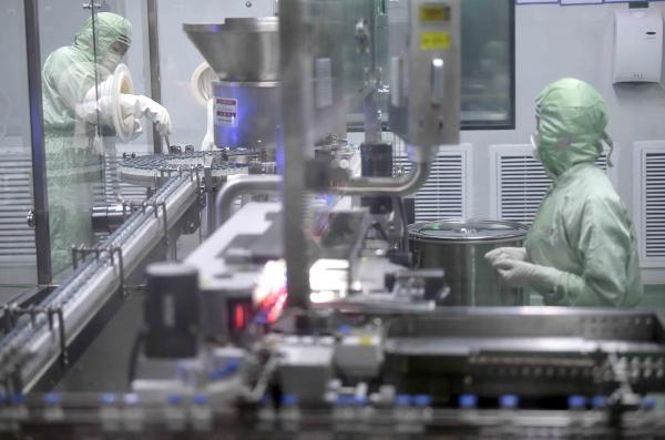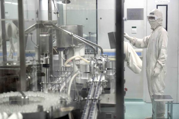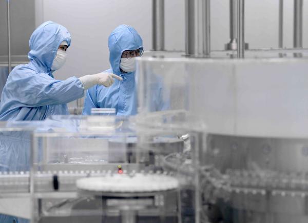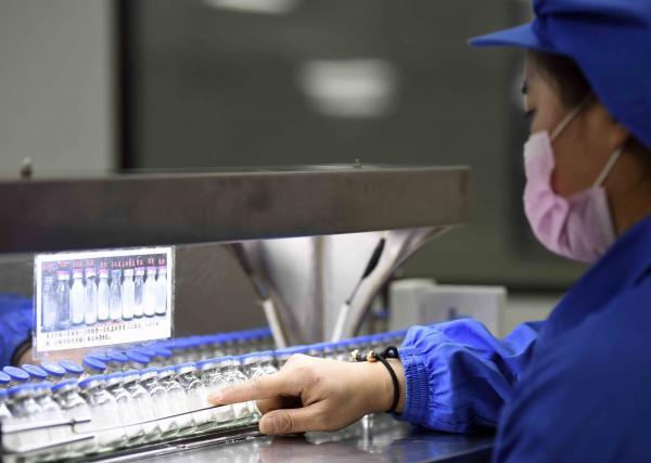 无菌生产车间正在生产灌装注射用炎琥宁。目前, 用于病毒性肺炎和病毒性上呼吸道感染的注射用炎琥宁每日产量可达36万支。