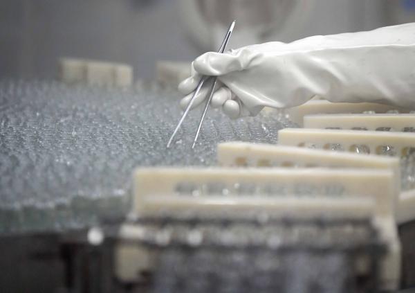 无菌生产车间正在生产灌装注射用头孢他啶,工人用镊子挑出倒着的瓶子。
