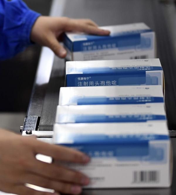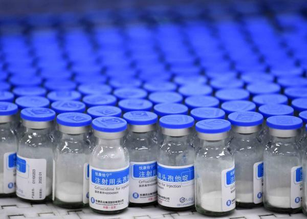 刚刚生产出来的注射用头孢他啶。注射用阿奇霉素、注射用胸腺五肽、注射用更昔洛韦、头孢菌素类抗菌药物等产量均大幅增加,抗病毒消炎类药品产量将增加两到三倍。