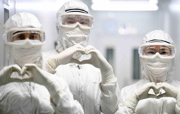 2月3日,身穿无菌服的工人们在无菌生产车间向武汉人民表达爱心。