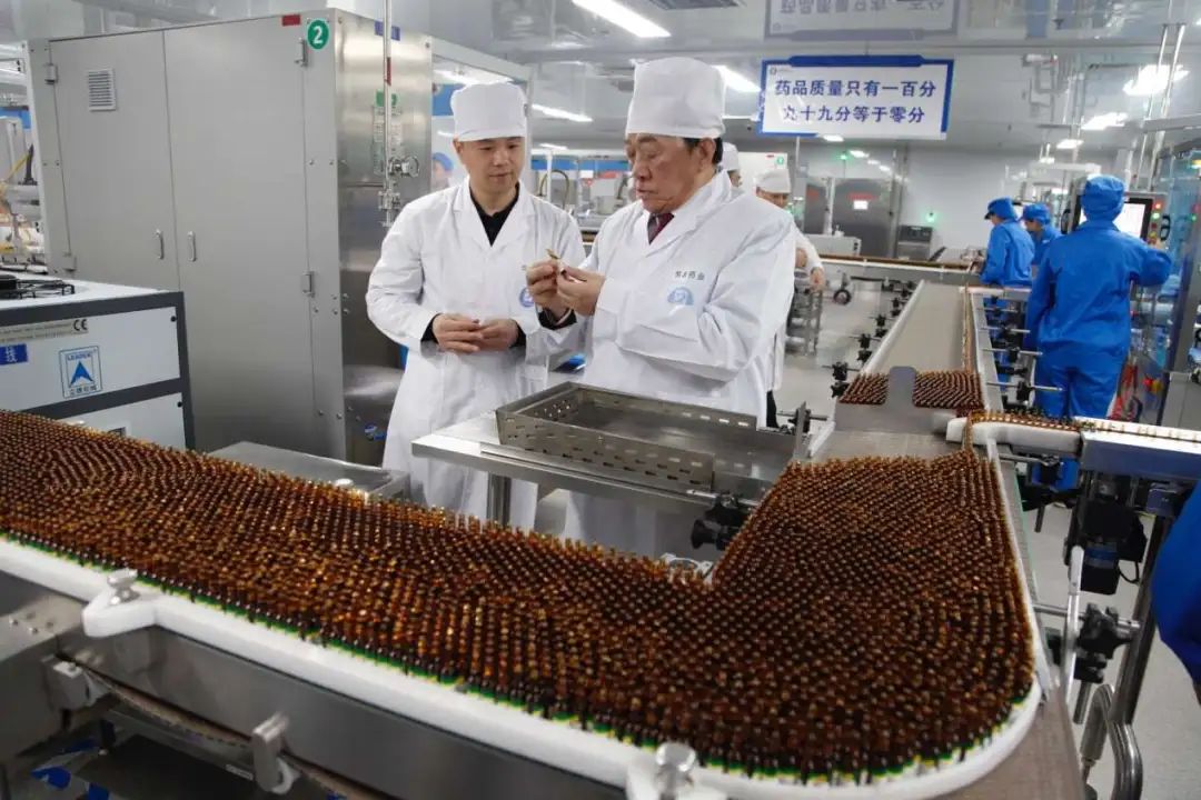图为中国医药工业百强企业澳门永利博彩官方网站集团董事长于伟仕在生产车间一线检查药品质量。