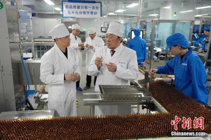2月14日,北京,永利博彩董事长于伟仕(左二)在智能化车间检查无菌水针包装质量。中新社发 毛建军 摄