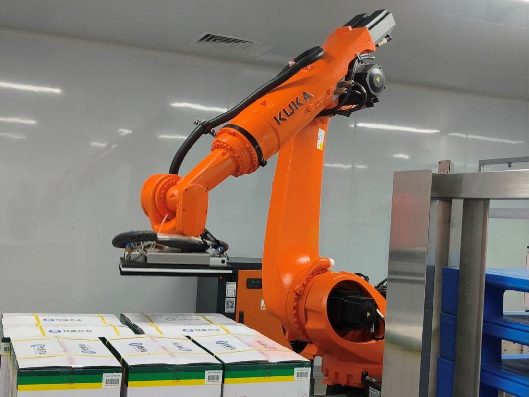智能化车间内,机器人在自动运卸药箱。
